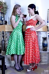 Lesbo babes in vintage polka-dot dresses lick sleek pantyhose clad pussies